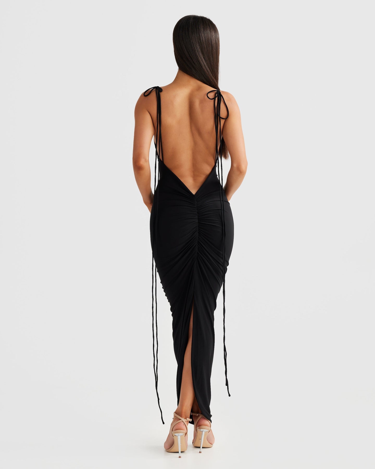 Denna fantastiska klänning har en klassisk rak halsringning och en unik detalj på baksidan, vilket gör den till ett mångsidigt val för alla tillfällen.