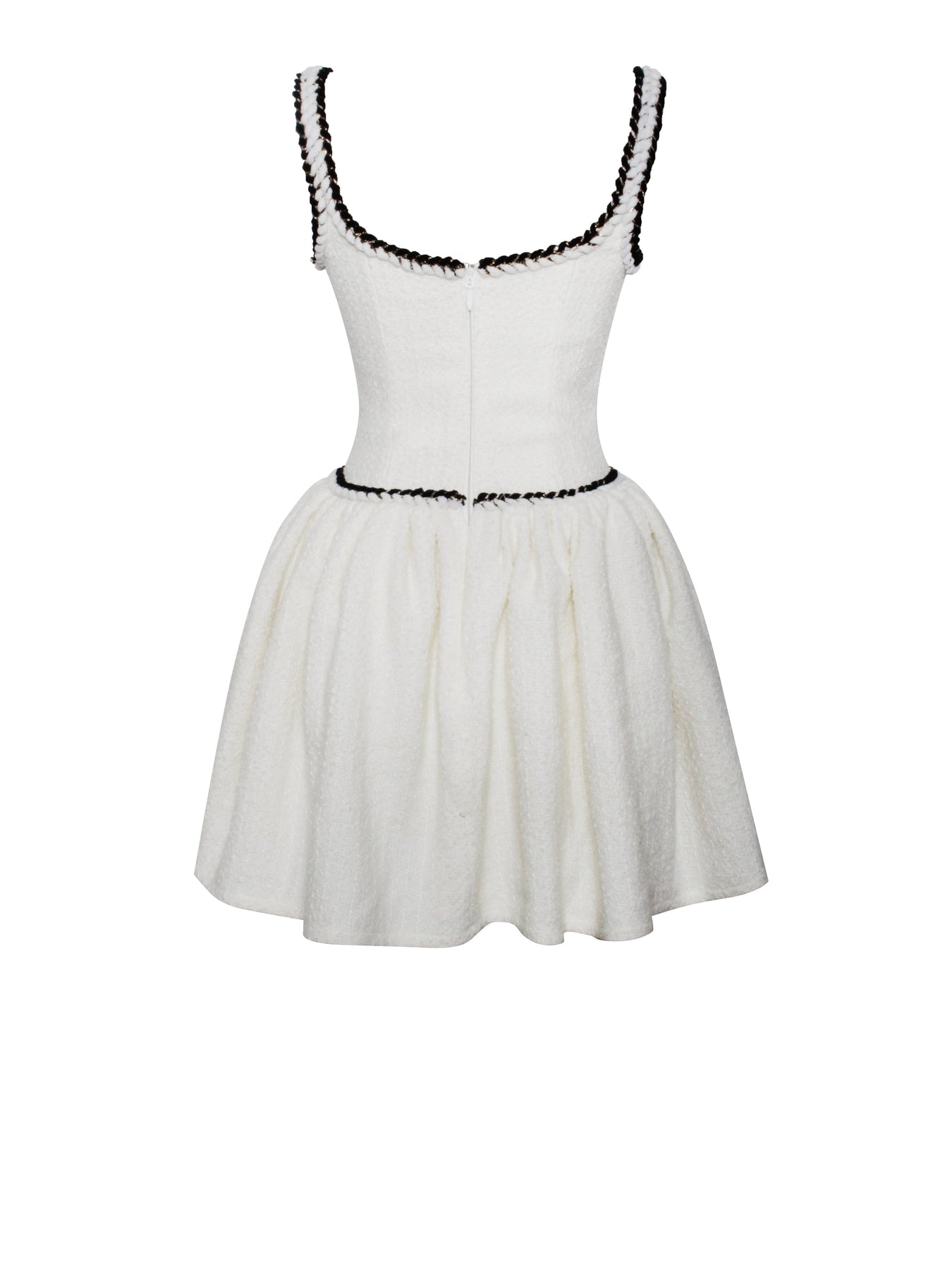 Upptäck Coco mini klänning, en tidlös klassiker i lyxigt boucletyg. Med en elegant låg skärning i halsen och vackra kantdetaljer, erbjuder denna klänning en sofistikerad touch.
