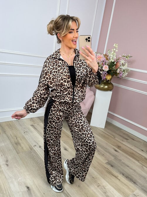 Släpp fram din vilda sida med vår stiliga leopardmönstrade träningsdräkt. Tillverkad av premium, andningsbart tyg, erbjuder detta matchande set både komfort och en iögonfallande look.